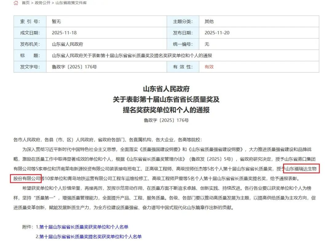 11月20日,山東省人民政府網(wǎng)站發(fā)布《山東省人民政府關(guān)于表彰第十屆山東省省長質(zhì)量獎(jiǎng)及提名獎(jiǎng)獲獎(jiǎng)單位和個(gè)人的通報(bào)》。山東福瑞達(dá)生物股份有限公司憑借在質(zhì)量管理與經(jīng)營創(chuàng)新方面的卓越表現(xiàn),榮登“第十屆山東省省長質(zhì)量…...