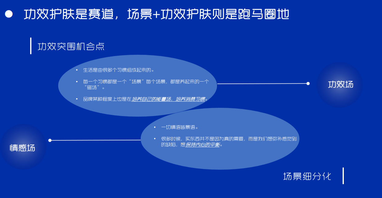 李婷在演講中分享了她的觀點:功效賽道的研發(fā)科技+成分濃度+護膚概念已經(jīng)卷到?jīng)]邊,與其被動卷,不如主動“圈地”。璦爾博士認為功效護膚是賽道,場景+功效護膚則是跑馬圈地。當我們談熬夜賽道的時候其實在談熬夜后的消費者的生理需求和心理需求,是功效場和情感場的互動。一方面需要注意到消費者熬夜后肌膚狀態(tài)的變化,另一方面也要洞察消費者熬夜后心理狀態(tài)的變化。用功效場和情感場的互動,完成和消費者的靈魂共振。