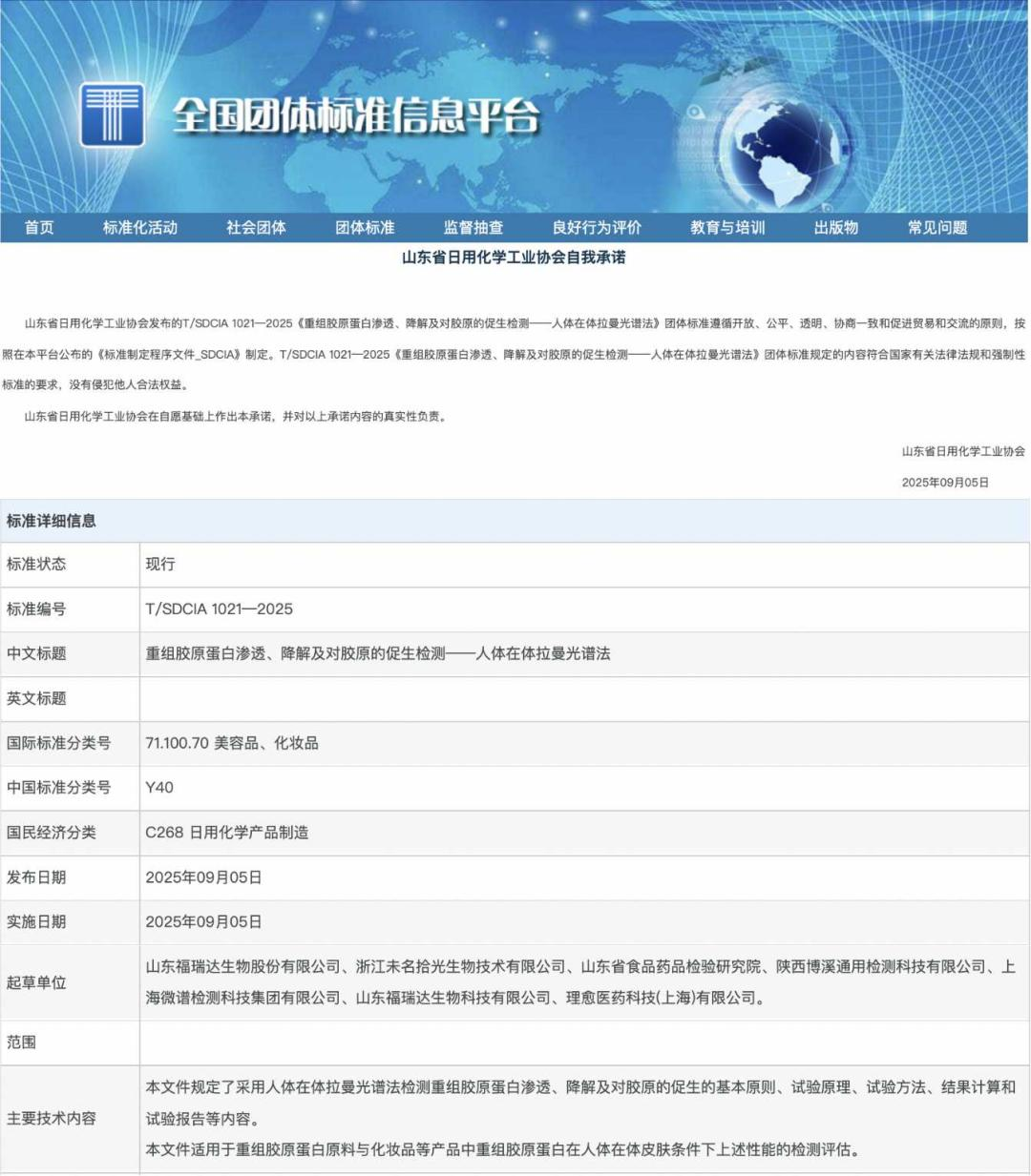 近日,由山東省日化行業(yè)協(xié)會歸口組織、山東福瑞達生物股份有限公司牽頭起草的《重組膠原蛋白滲透、降解及對膠原的促生檢測——人體在體拉曼光譜法》團體標(biāo)準(zhǔn)正式發(fā)布實施,標(biāo)志著重組膠原蛋白皮膚滲透檢測有了新標(biāo)準(zhǔn)。